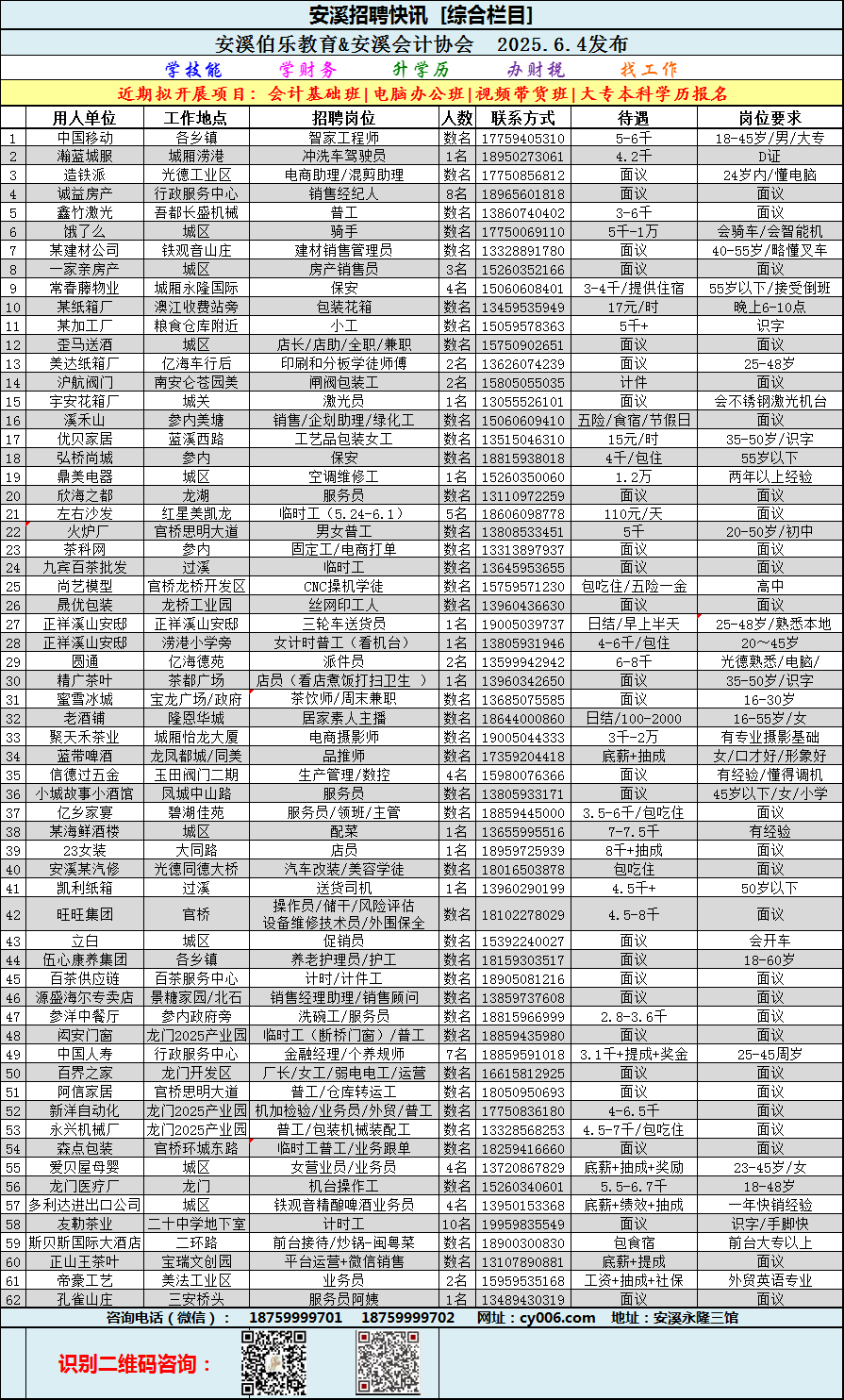 安溪招聘快讯-综合栏目&文教专栏【2025.6.4发布】